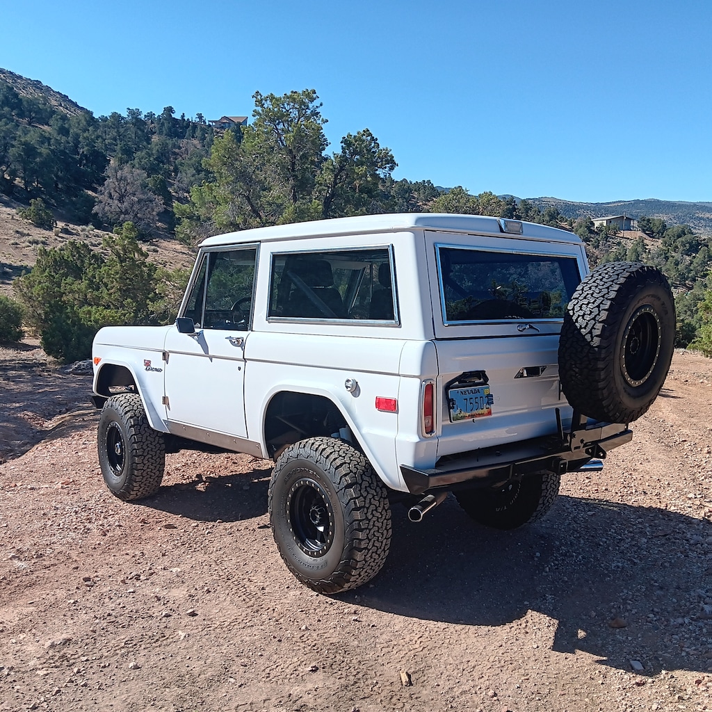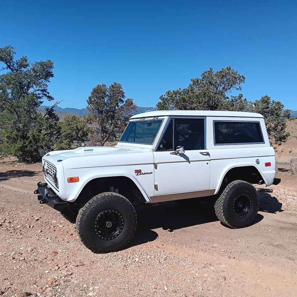 Everything on this car is new, and we have a spec sheet for it. This 1972 Ford Bronco has a Edelbrock fuel injection 351cu.in. V-8 Windsor crate motor with 400 hp 440 ft pounds. Aluminum heads. It has an R C-6 three-speed automatic transmission.  Atlas 4-1 twin stick transfer case. It has an eight-quart oil pan.  Ford 250 steering box with cross brace.  Bluetooth fans and digital gauges.  It has a 2-inch body lift, and full family cage attached to the frame.  Ford 9 inch with Detroit locker/Moser axles/rap trap axle wrap eliminator.   Dana 44 front axle quick lock locker/disc brakes.  LED lights throughout with all new light bases on all lights.  Painless wire harness.  Method 15-10 rims and new 33 10.5 bfg all terrains.   Tires and rims are like new.  The odometer shows 994.0 miles.